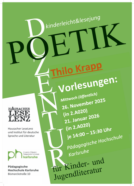 Seit 2014 halten Stipendiat:innen des Literaturfestivals Hausacher LeseLenz Poetik-Vorlesungen an der PHKA. Die Poetik-Dozentur „kinderleicht & lesejung“ ist die einzige Poetik-Dozentur für Kinder- und Jugendliteratur bundesweit. Sie findet im Wintersemester statt und beinhaltet eine öffentliche Vorlesung mit zwei Terminen, eine Schreibwerkstatt für Studierende sowie eine öffentliche Lesung in Kooperation mit der Literarischen Gesellschaft Karlsruhe. Im Rahmen der Poetik-Dozentur erfahren Studierende etwas darüber, was es heißt Autor:in zu sein und wie sich der Prozess der Literaturwerdung eines Textes mit Hilfe sprachlicher und formaler Mittel vollzieht.