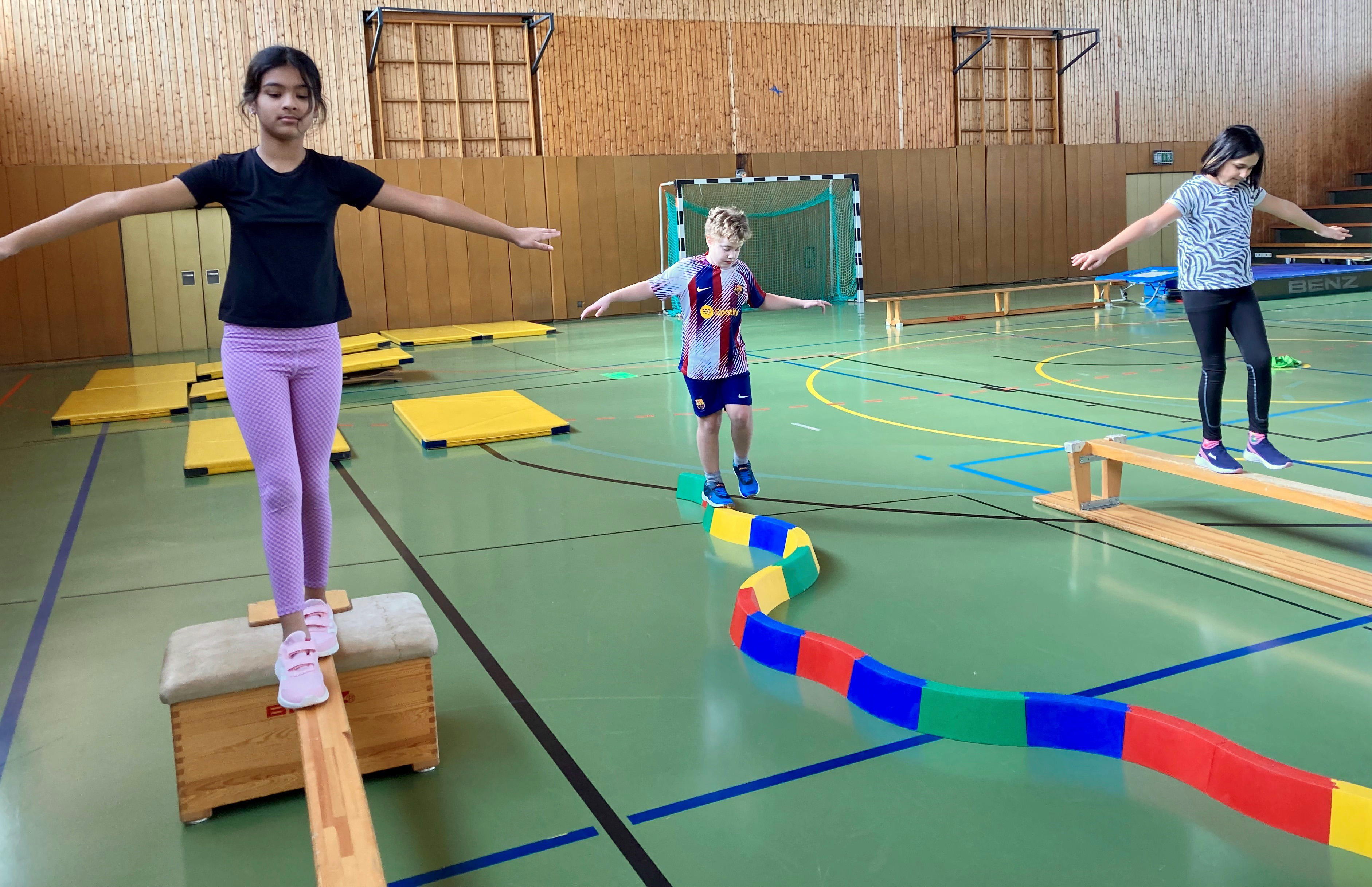 Genau hier setzt die „Sportschuhbande“ der Pädagogischen Hochschule Karlsruhe (PHKA) an. Die wissenschaftlich entwickelte und begleitete Bewegungs- und Sportförderung startete vergangenes Jahr als Pilotprojekt an der Hardtschule und der Leopoldschule und wird von speziell geschulten PHKA-Lehramtsstudierenden in Form einer klassenübergreifenden, zusätzlichen Sportstunde realisiert. Dabei geht es einmal wöchentlich nicht nur um die Förderung motorischer Fertigkeiten wie Springen, Hangeln oder Balancieren, sondern auch um Ich-Stärkung und ein positives Körpergefühl.