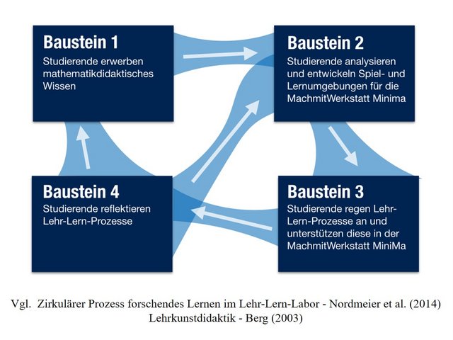 Die vorherrschenden Handlungs- und Beobachtungssituationen unter Laborbedingungen, außerhalb der Gesetzmäßigkeiten von Bildungseinrichtungen, schaffen geschützte, komplexitätsreduzierte Handlungsspielräume mit exzellenten Voraussetzungen für Beobachtung und Reflexion. Erziehende und Lehrkräfte können so gemeinsam mit ihren Kindern in den von Studierenden vorbereiteten Spiel- und Lernumgebungen Mathematik entdecken und erforschen (vgl. Professionalisierung pädagogischer Fach- und Lehrkräfte). Der Handlungsspielraum in Form der MachmitWerkstatt MiniMa bietet Studierenden im Praktikum die Möglichkeit eines forschungsbasierten Handelns mit den Kindern nach dem Prinzip des entdeckenden und handlungsorientierten Lernens. Einen wesentlichen Professionalisierungsaspekt bildet dabei die intensive Reflexion von Handlungssituationen auf der Grundlage von Videoaufnahmen.