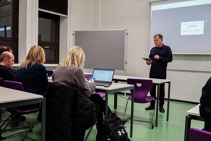 Bei seinem einwöchigen Arbeitsbesuch an der Pädagogischen Hochschule Karlsruhe hatte sich der erfahrene Medienpädagoge Ruhtenberg einen ganzen Abend freigehalten, um Lehrenden und Studierenden vom Stand der Digitalisierung in der schwedischen Pädagogik zu berichten. BYOD – bring your own device – war das Motto der Veranstaltung am 4. Dezember 2019, 18.15 Uhr im neuen Seminarraum 3.107. Die Kollegiale Hochschuldidaktik hatte gemeinsam mit dem europäischen Hochschulkooperationsprojekt proPIC dazu eingeladen. Trotz der späten Stunde waren zahlreiche Gäste zu dem Vortrag in englischer Sprache erschienen.