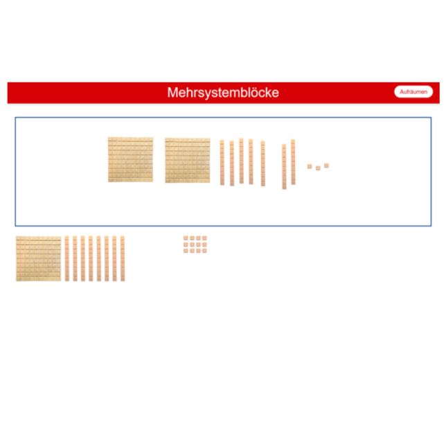 Es stehen je 20 Tausenderwürfel, Hunderterplatten, Zehnerstangen und Einerwürfel zur Verfügung. Das Material kann mit der Maus in den blauen Rahmen geschoben werden. Angeklicktes Material kann mit der Esc-Taste zurückgelegt werden.
