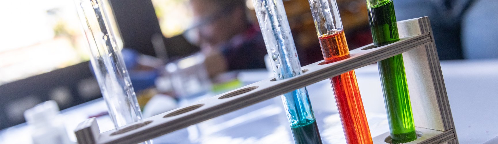 Ein chemischer Versuchsaufbau im Labor. In der Luft schweben Seifenblasen. Im Hintergrund arbeiten Menschen in Laborkitteln.